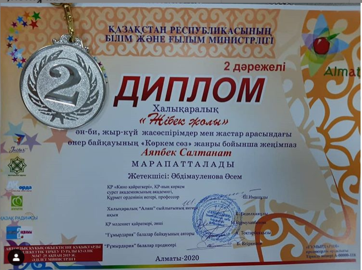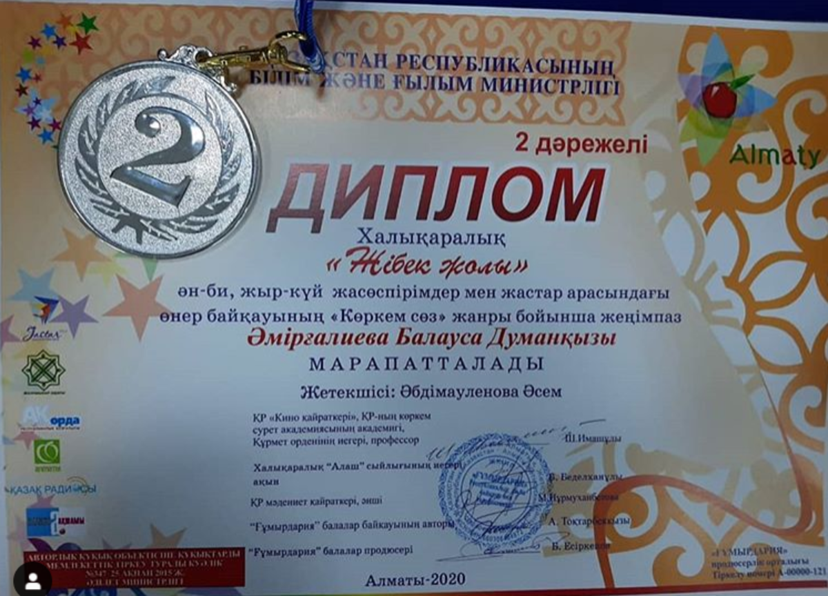 Жетісу ауданы №148 мектеп-гимназияның 5-6 сынып оқушылары Халықаралық "Жібек жолы" ән-би, жыр-күй жасөспірімдер мен жастар арасындағы өнер байқауына қатысып, көркем сөз жанры бойынша жүлделі орындарды иеленді. Жетекшісі Әбдімауленова Әсем.