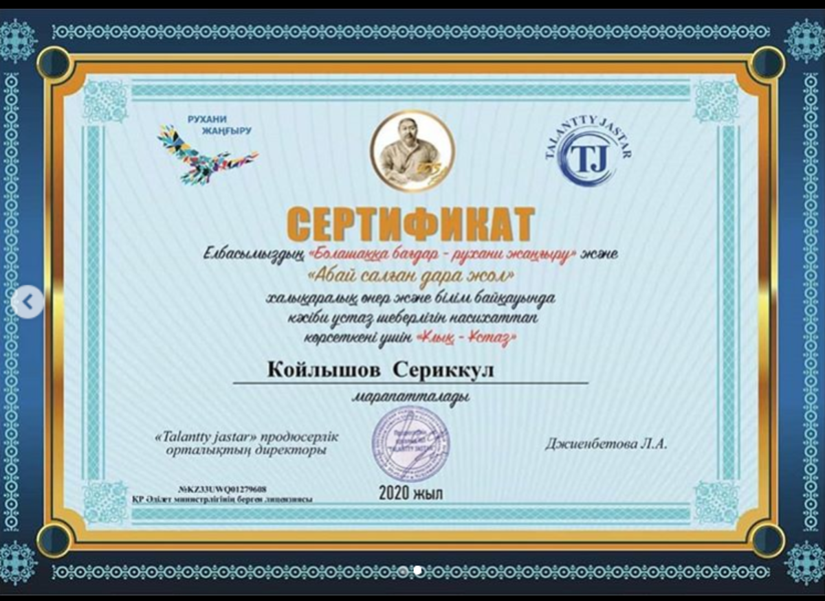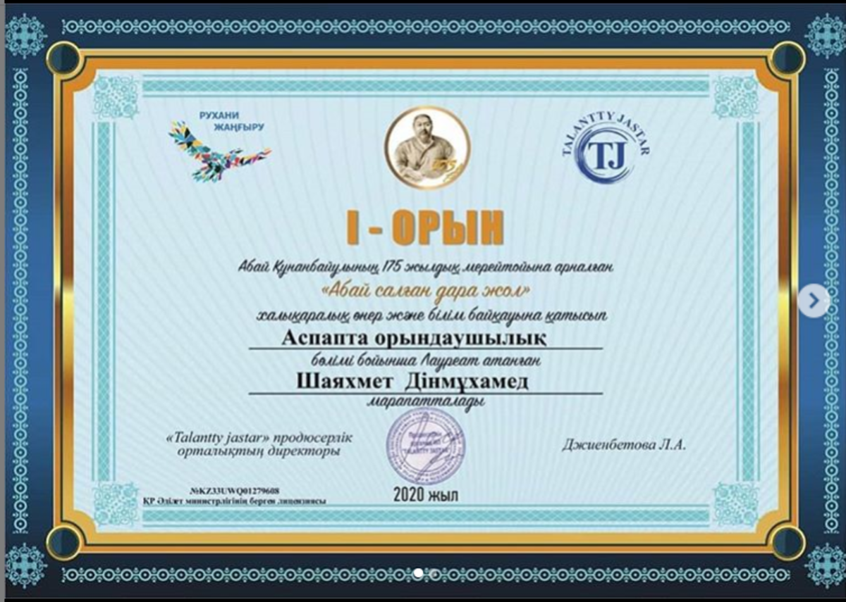 Жетісу ауданы №148 мектеп-гимназияның 6Б сынып оқушысы Шаяхмет Дінмұхамед АБАЙДЫҢ 175 ЖЫЛДЫҒЫНА арналған "Абай салған дара жол" халықаралық өнер және білім байқауына қатысып "Аспапта орындаушылық" бөлімі бойынша І ОРЫН иеленді. Жетекшісі Қойлышев Серікқұл. Құттықтаймыз!