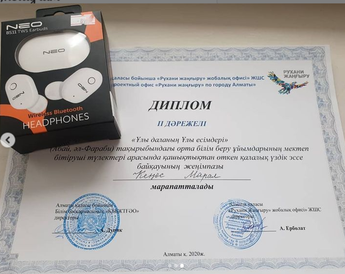 Жетісу ауданы №148 мектеп-гимназияның 11Б сынып оқушысы Кеңес Марал "Ұла даланың Ұлы есімдері" (Абай, Әл-Фараби) тақырыбындағы орта білім беру ұйымдарының мектеп бітіруші түлектері арасында қашықтықтан өткен ҚАЛАЛЫҚ үздік эссе байқауынан жүлделі ІІ ОРЫН иеленді. Жетекшісі Сагимова Гүлнұр Көзтайқызы.