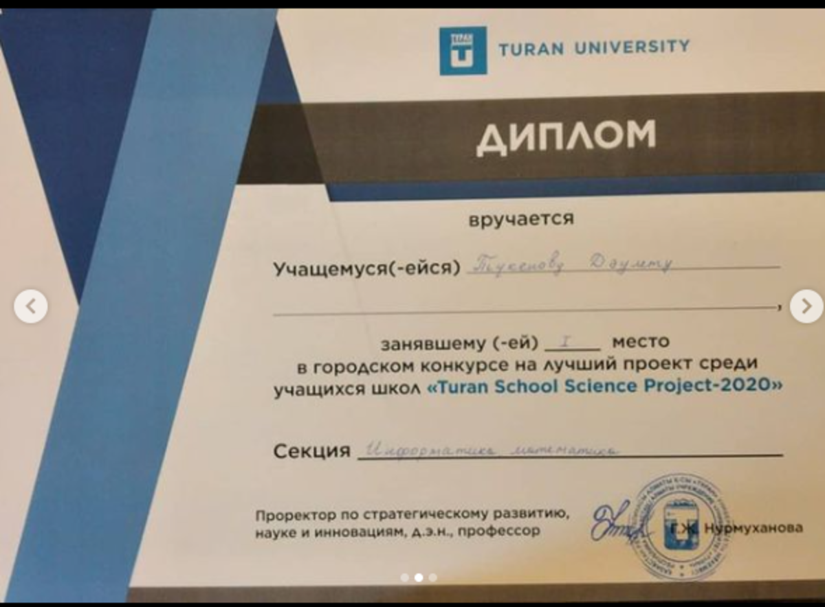 Жетісу ауданы №148 мектеп-гимназияның 6Б сынып оқушылары Тукенов Дәулет пен Шаяхмет Дінмұхамед ТҰРАН УНИВЕРСИТЕТІНІҢ ұйымдастыруымен өткен, мектеп оқушылары арасындағы "Turan School Science Project-2020" қалалық конкурсының математика пәні бойынша I ДӘРЕЖЕЛІ ЖҮЛДЕГЕРЛЕРІ атанды. Жетекшісі Базарбаева Крымызы Женисбаевна.