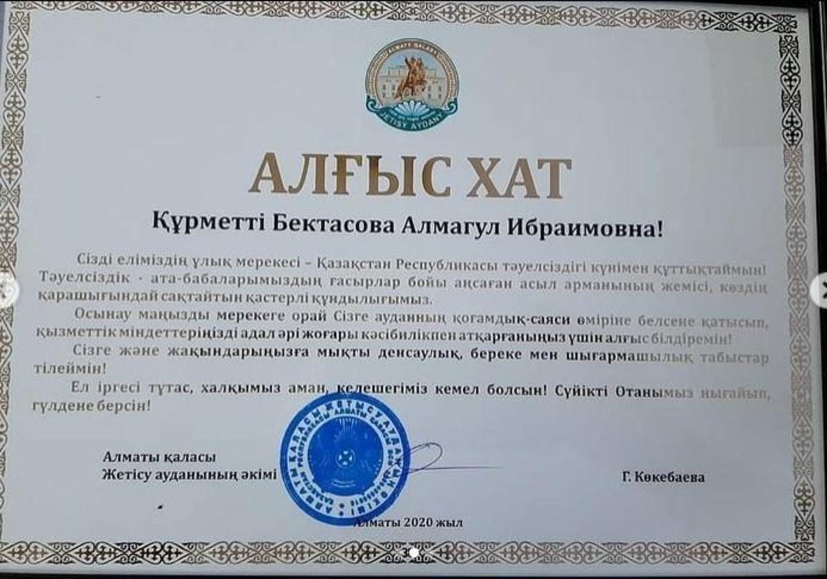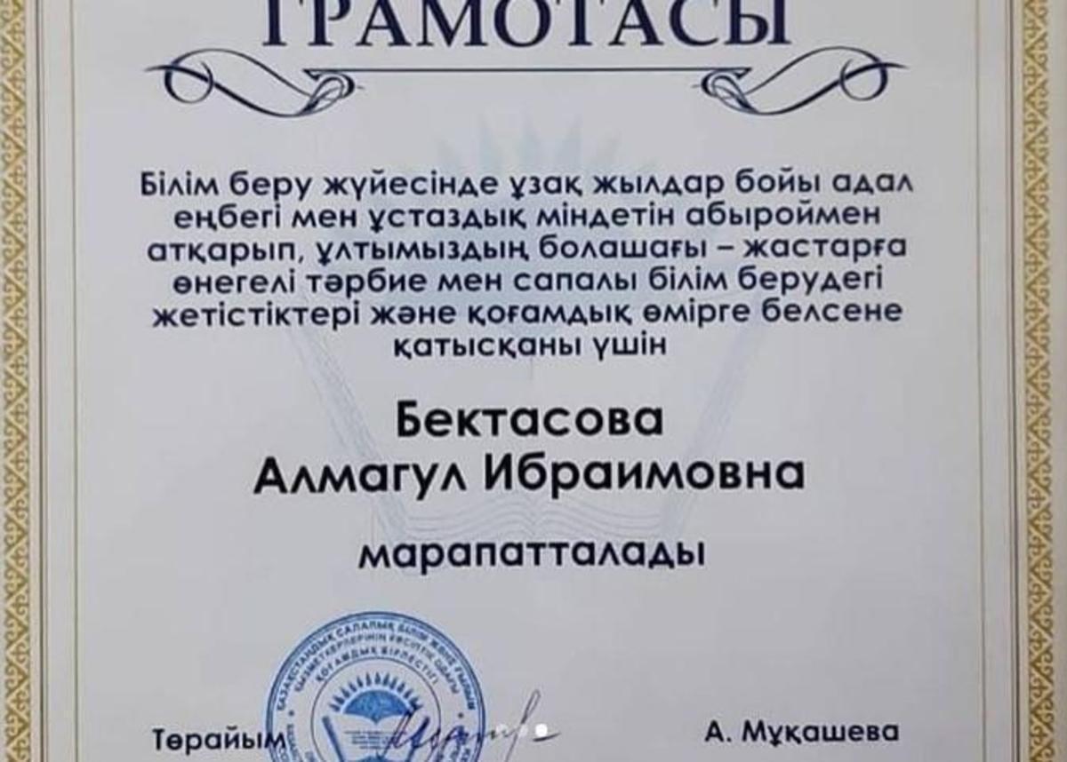 №148 мектеп-гимназияның математика пәнінің мұғалімі, мектептегі "Ұстаз" кәсіподақ ұйымының төрайымы Бектасова Алмагүл Ибраимқызы еліміздің басты мерекесі Тәуелсіздік күні қарсаңында Алматы қаласы Жетісу ауданы әкімінің АЛҒЫС ХАТЫН иеленді