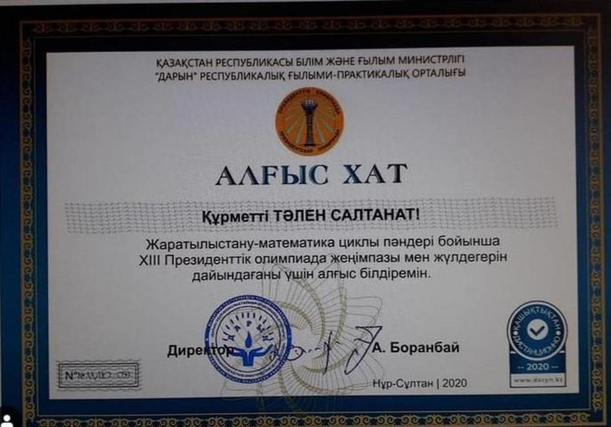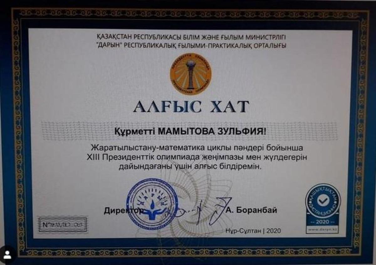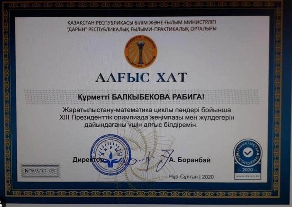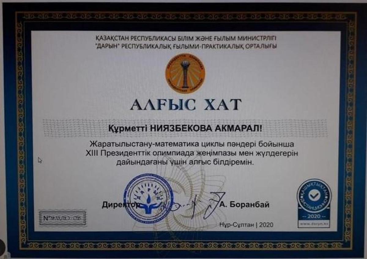 №148 мектеп-гимназияның 11Б сынып оқушысы Алимбек Айым Қазақстан Республикасының білім және ғылым министрлігі ұйымдастырған республикалық жаратылыстану-математикалық бағыттағы пәндерден ХІІІ ПРЕЗИДЕНТТІК ОЛИМПИАДАДАН жүлделі ІІІ ОРЫН иеленді