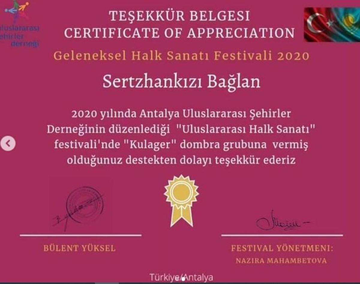 №148 мектеп-гимназияның "ҚҰЛАГЕР" домбырашылар оркестрі Анталия Халықаралық Қалалар қауымдастығының ұйымдастыруымен Қазақстан-Туркия мемлекеттері жас таланттарының қатысуымен өткен Ұлттық Дәстүрлі Өнер байқауында жүлделі ІІІ орынды иеленді