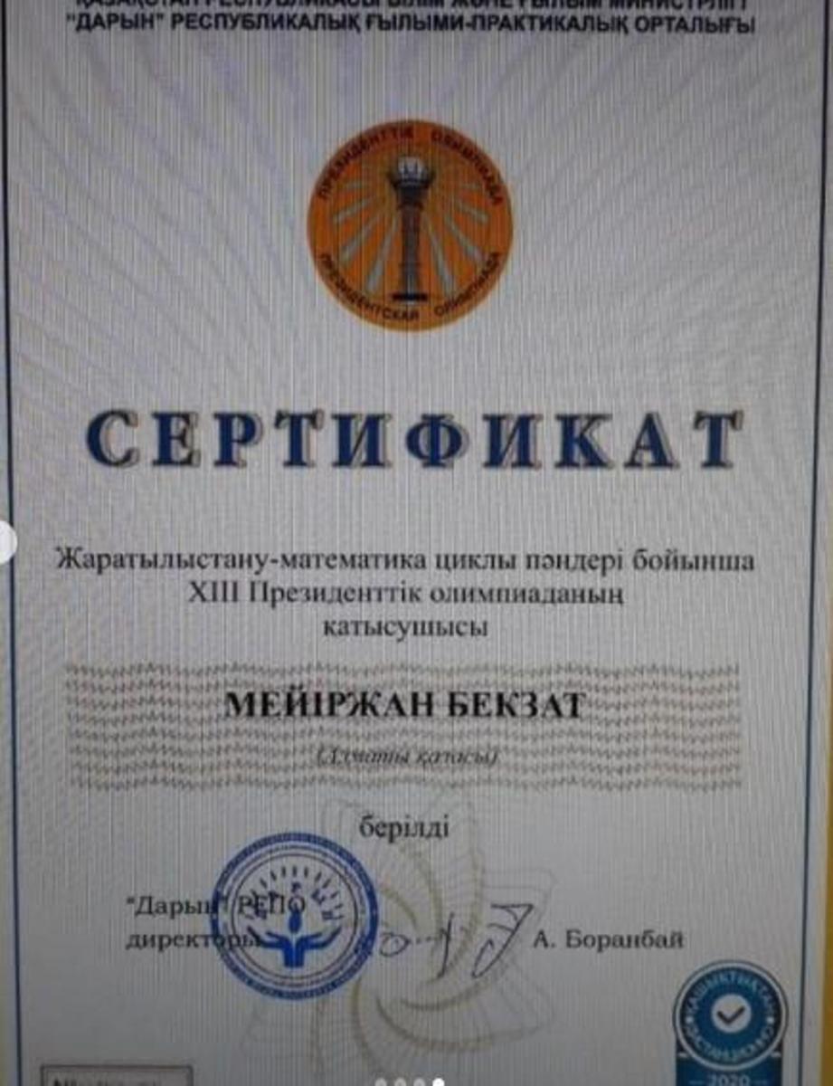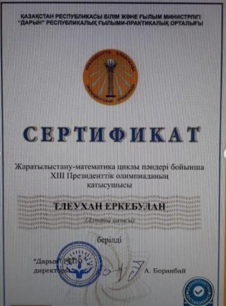 Жетісу ауданы №148 мектеп-гимназияның 11-сынып оқушылары Манап Мадина, Тлеухан Еркебұлан, Айтынбекова Гаухар, Мейіржан Бекзат Қазақстан Республикасының білім және ғылым министрлігі ұйымдастырған республикалық жаратылыстану-математикалық бағыттағы пәндерден ХІІІ ПРЕЗИДЕНТТІК ОЛИМПИАДАҒА қатысып, сертификат иеленді. Шәкірттерімізді құттықтаймыз! Мақтан етеміз!