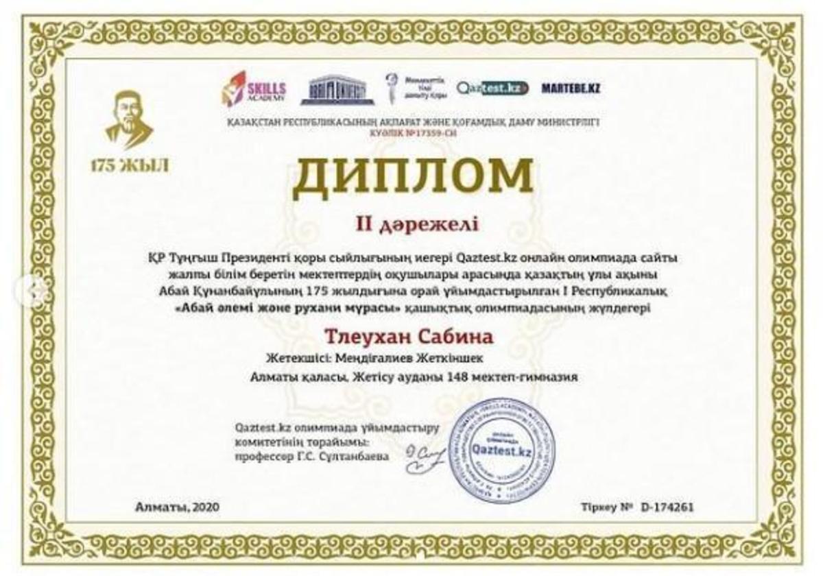 "Kemel Academy" онлайн-мектебі ұйымдастырған "Қызықты Математика және Логика" атты IV Рееспубликалық онлайн-олимпиадада І орынды иеленгені үшін және ҚР Тұңғыш Президенті қоры сыйлығының иегері Qaztest.kz онлайн олимпиада сайты қазақтың ұлы ақыны Абай Құнанбайұлының 175 жылдығына орай ұйымдастырған І Республикалық "Абай әлемі және рухани мұрасы"қашықтық олимпиадасында ІІ орынды иеленгені үшін 7 "Б" сынып оқушысы Тлеухан Сабина марапатталады.