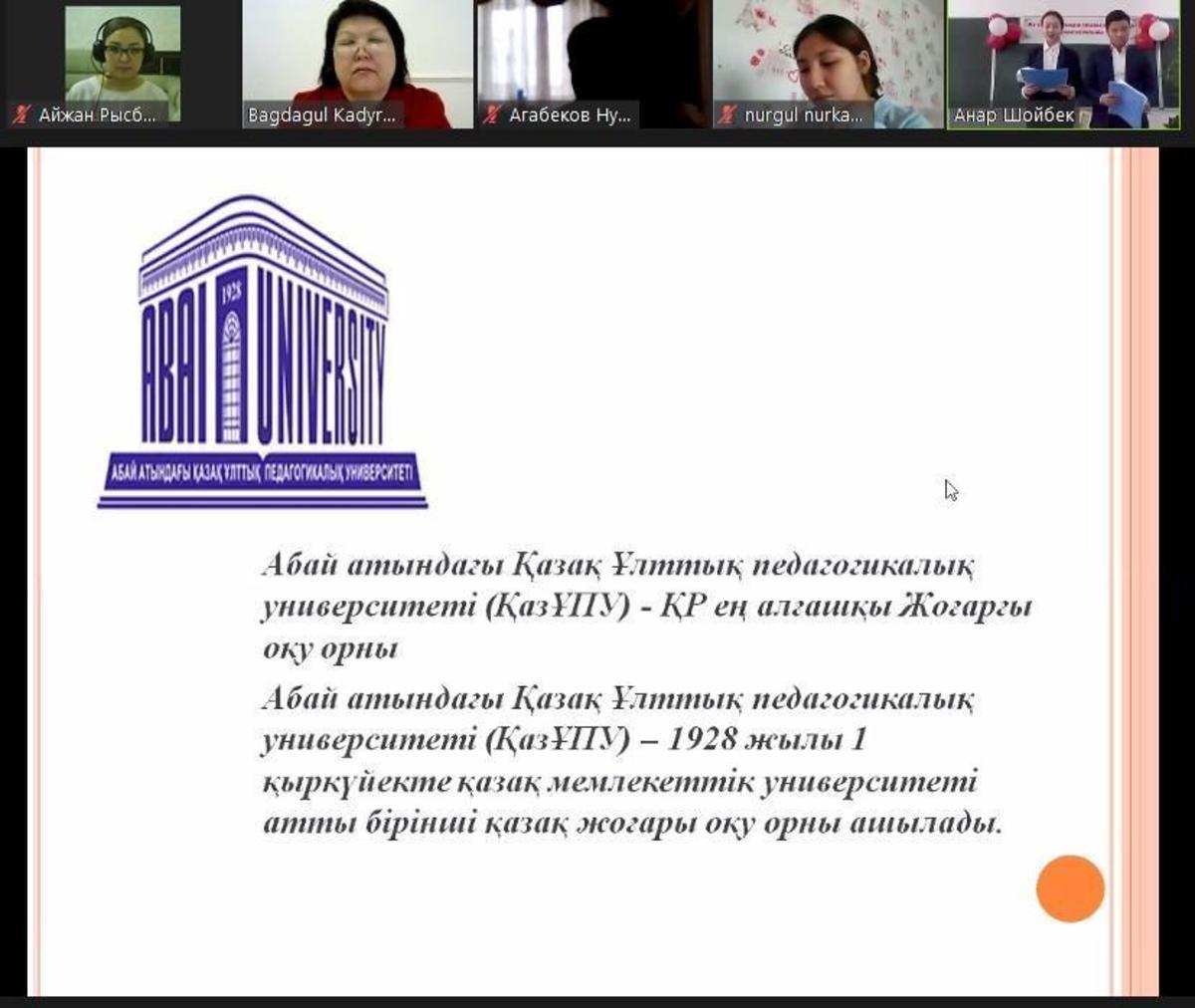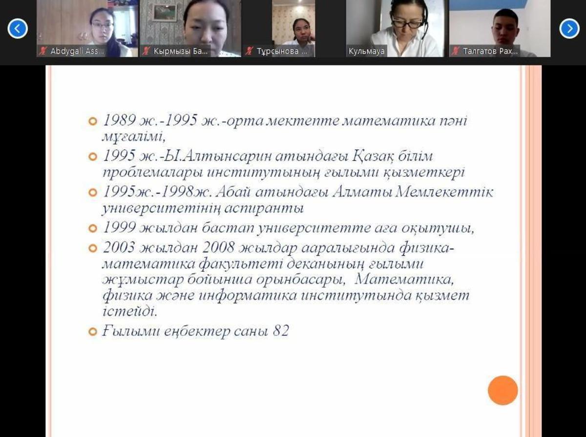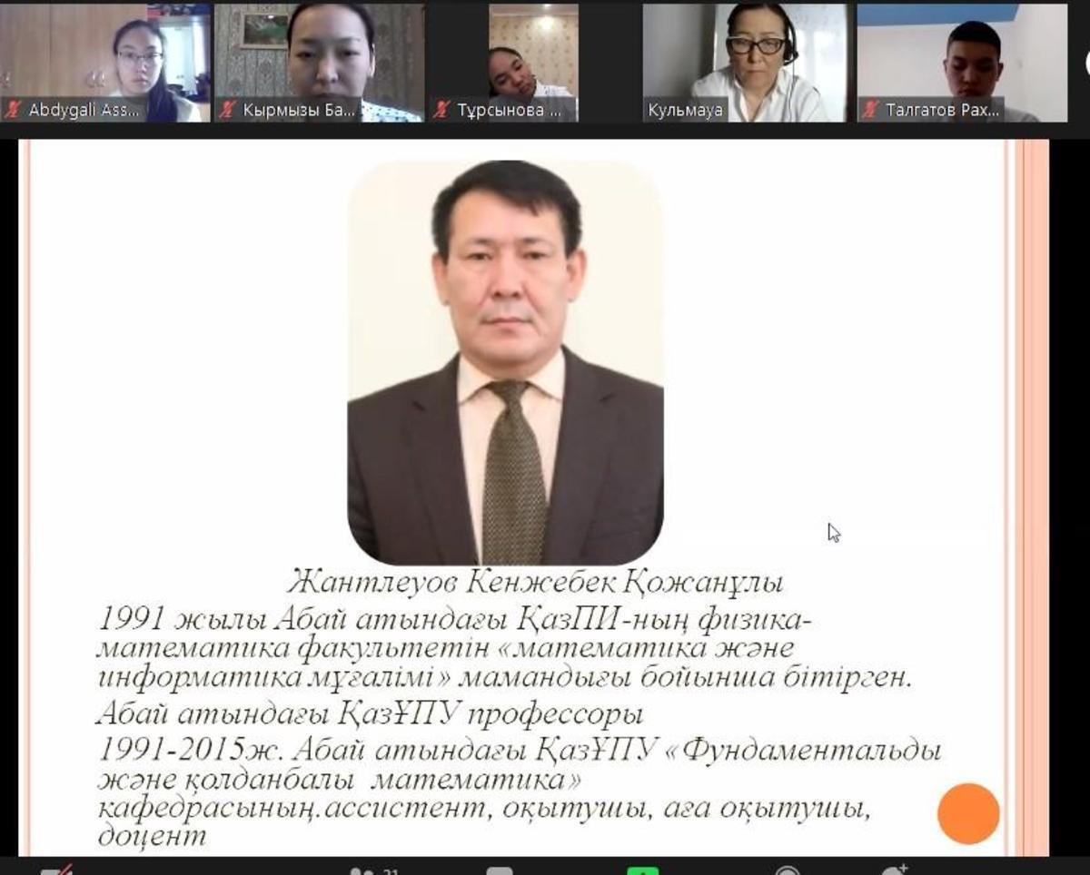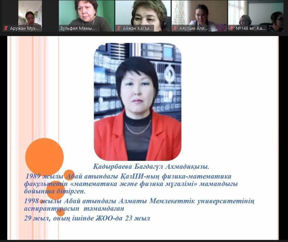 Жетісу ауданы №148 мектеп- гимназияда 18.01 - 28.01 аралығында мектептің оқу жоспарына сәйкес "Математика ғылымдар патшасы, информатика ақпараттар ғылымы" тақырыбында математика және информатика кафедрасының онкүндігі өтіліп жатыр. Онкүндік аясында математика пәні мұғалімдері Шойбек Анар, Нағыманова Гүлмауаның ұйымдастыруымен 9-10 сыныптар арасында "Математика - ақылдың әуені, музыка - сезім математикасы" тақырыбында онлайн кездезу өтті. Кездесуге педагогика ғылымдарының кандидаты, доцент Қадырбаева Бағдагүл Ахмадиқызы қатысты.