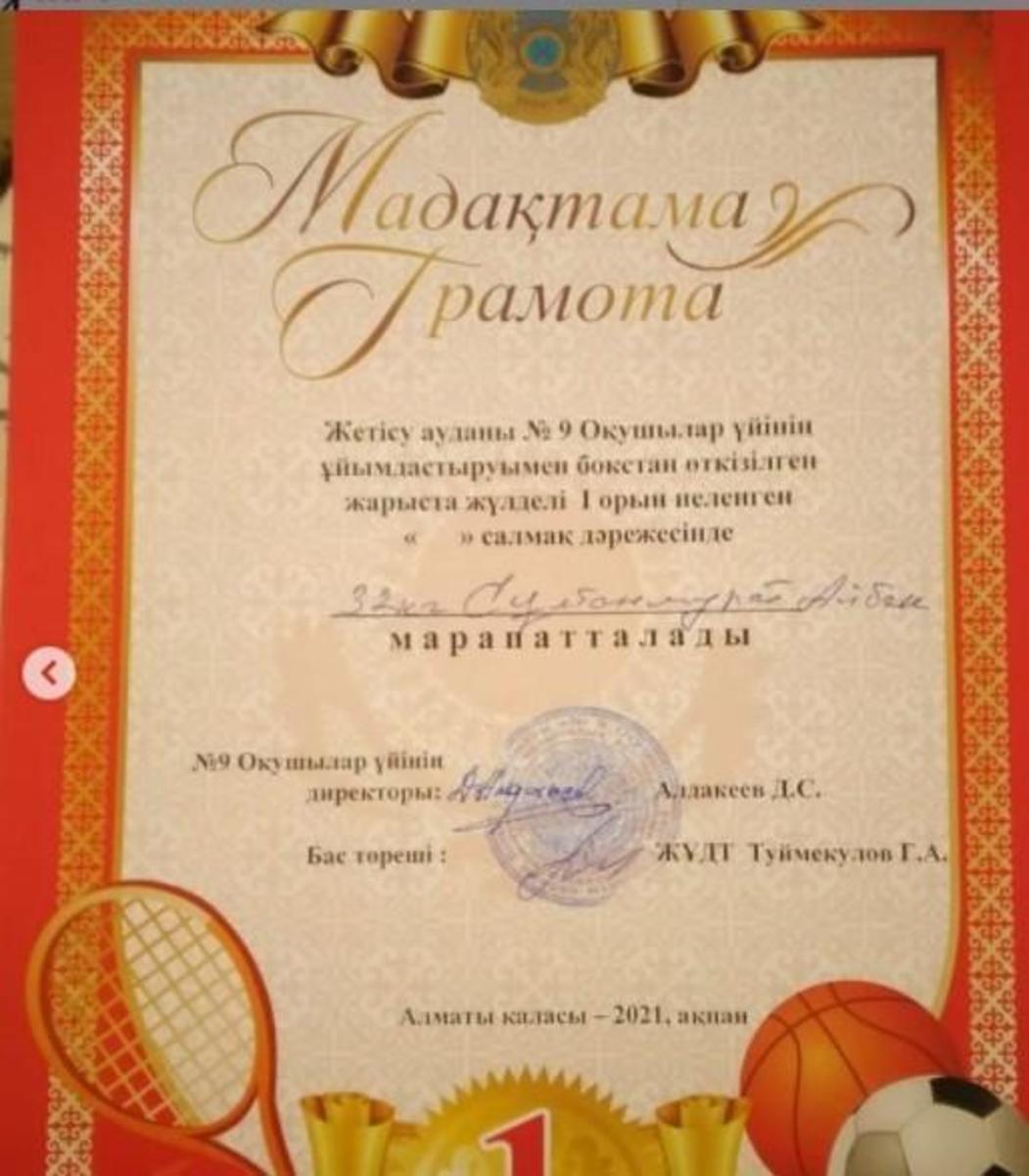 №148 мектеп-гимназияның 5Д сынып оқушысы Сұлтанмұрат Айбек Жетісу ауданы №9 оқушылар үйі бокстан өткізген жарыста жүлделі І ОРЫН иеленді