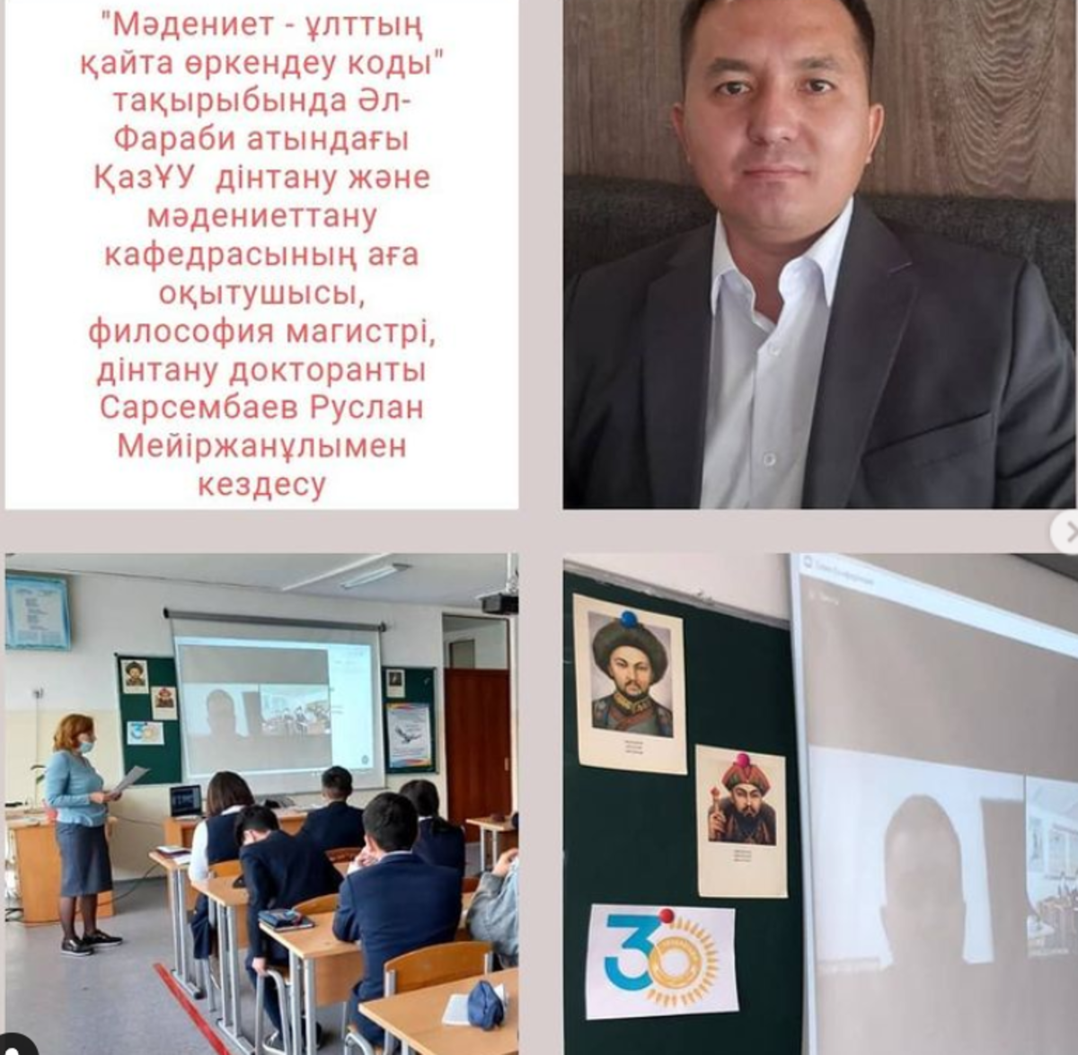 Жетісу ауданы №148 мектеп-гимназия оқушылары “Ұлы дала өркениеттері” атты байқауға қатысуда. Байқау аясында "Мәдениет - ұлттың қайта өркендеу коды" тақырыбында Әл-Фараби атындағы Қазақ Ұлттық Университетінің дінтану және мәдениеттану кафедрасының аға оқытушысы, философия магистрі, дінтану докторанты Сарсембаев Руслан Мейіржанұлы.