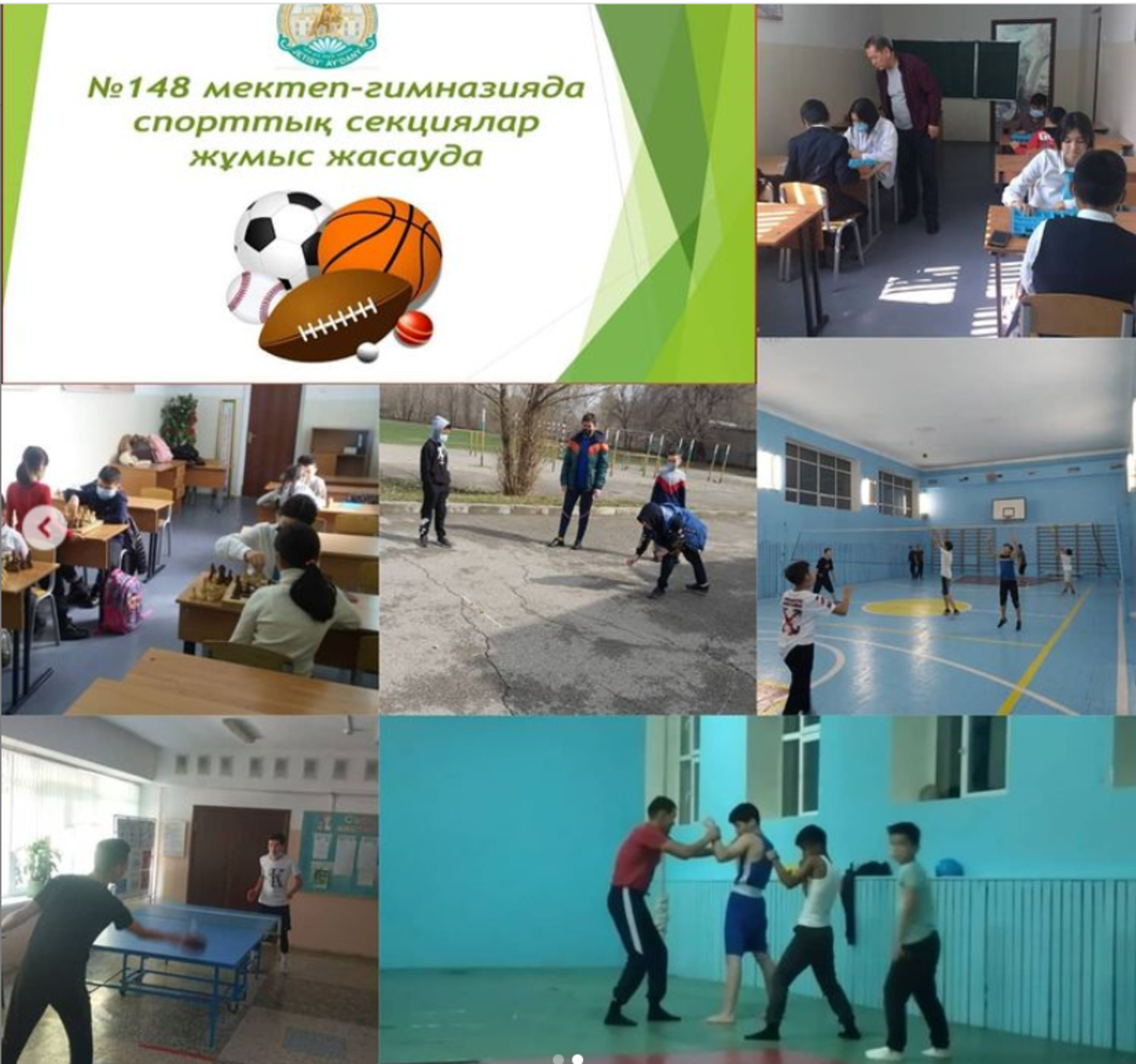 Жетісу ауданы №148 мектеп-гимназияда бұқаралық спортты дамыту, жас ұрпақтың денсаулығын нығайту, балалардың бос уақытын ұтымды пайдалану мақсатында және жасөспірімдер арасындағы құқық бұзушылықтың алдын алу бойынша бокс, гандбол, футбол, баскетбол, волейбол, тоғызқұмалақ, дойбы, шахмат, бес асық, үстел теннисі спорттық секциялар жұмыс жасайды.