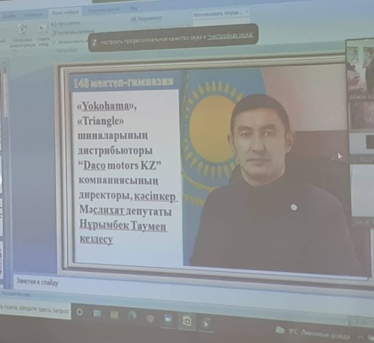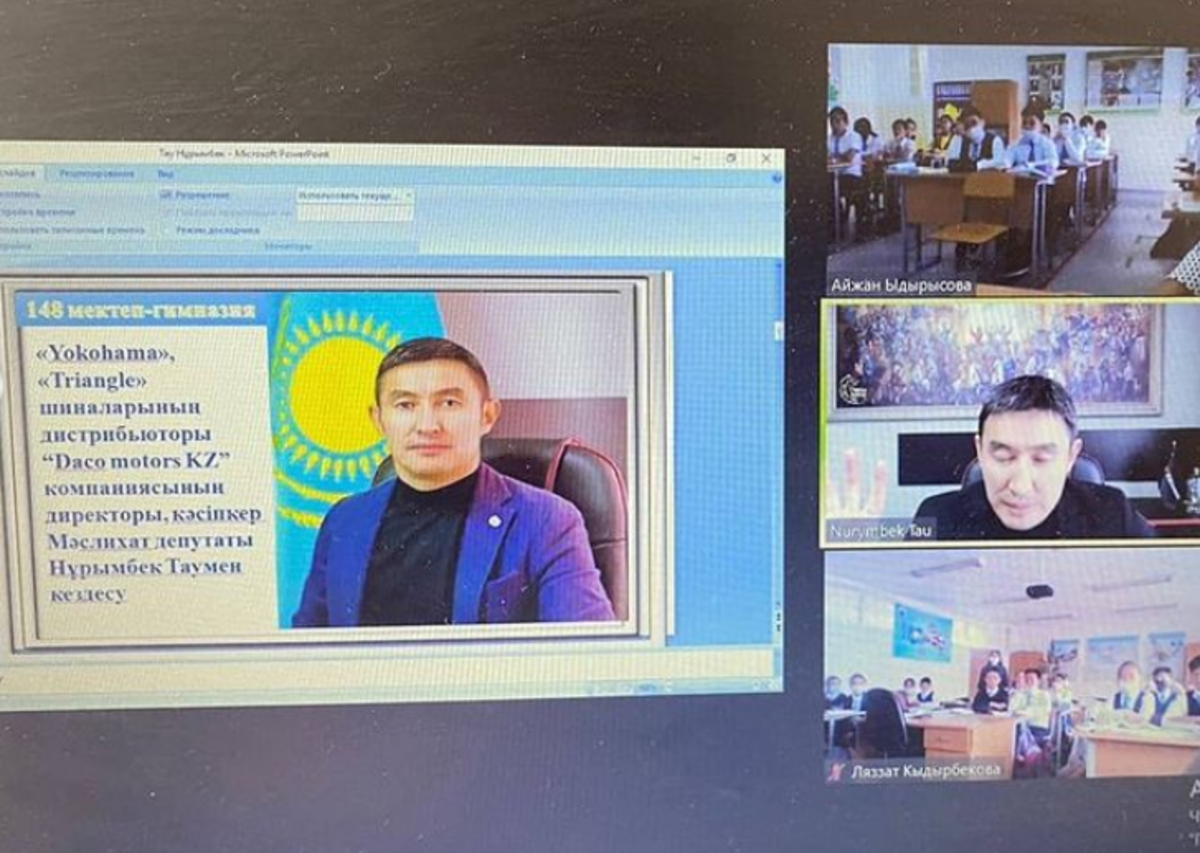 Жетісу ауданы №148 мектеп-гимназия оқушылары "Ұлы дала өркениеттері" атты байқауға қатысуда. Байқау аясында 7 «Г» сынып жетекшісі Ыдырысова Айжанның ұйымдастыруымен «Жетістіктер тарихы» тақырыбында «Yokohama», «Triangle» шиналарының дистрибьюторы “Daco motors KZ” компаниясының директоры, кәсіпкер, Алматы қаласы маслихатының депутаты Нұрымбек Таумен кездесу өткізілді.