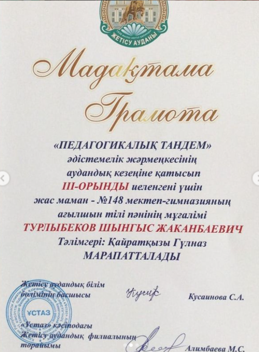 Жетісу ауданы №148 мектеп-гимназияның ағылшын тілі пәнінің мұғалімі ТҰРЛЫБЕКОВ ШЫҢҒЫС ЖАҚАНБАЙҰЛЫ "Педагогикалық тандем" әдістемелік жәрмеңкесінің аудандық кезеңіне қатысып ІІІ ОРЫН иеленді