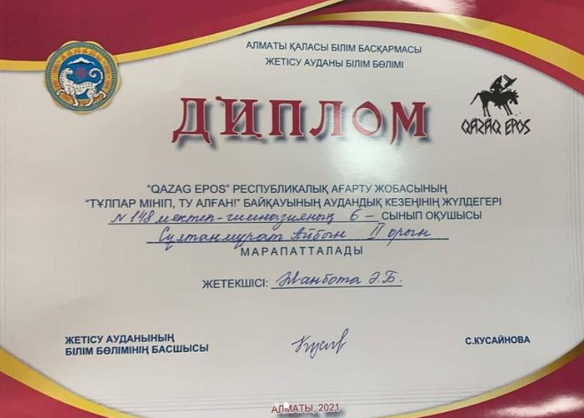 Жетісу ауданы №148 мектеп-гимназияның 6Д сынып оқушысы СҰЛТАНМҰРАТ АЙБЫН "QAZAQ EPOS" республикалық жобасының "Тұлпар мініп, ту алған" байқауының АУДАНДЫҚ кезеңінен ІІ ОРЫН иеленді