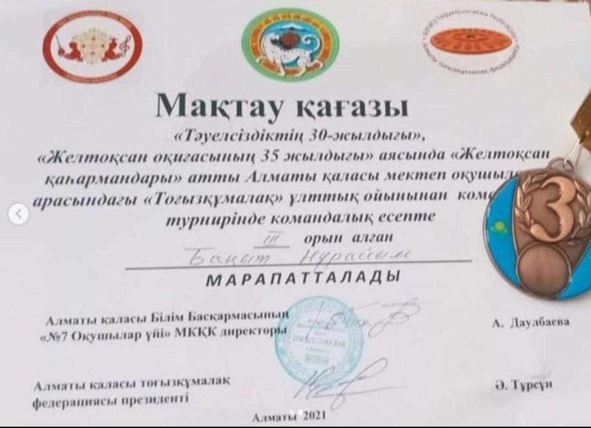 Жетісу ауданы №148 мектеп-гимназияның оқушысы Бақыт Нұрайым тоғызқұмалақтан Алматы қаласы бойынша оқушылар арасында өткен жарыстан ІІІ ОРЫН иеленді.