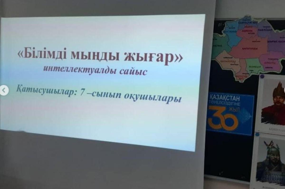 "Тіл мен тарих-халықтың қос қанаты" тақырыбында қоғамдық-гуманитарлық пәндер кафедрасының онкүндігі аясында Мырзабекова Сұлушаш, Рустемова Мадина 7Ә, 7В, 7Ғ, 7Д сыныптарымен "Білімді мыңды жығар" тақырыбында интеллектуалды сайыс өткізді