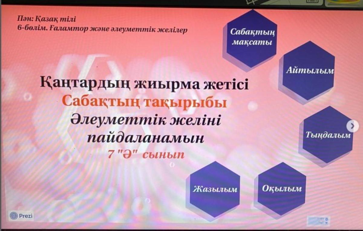 Жетісу ауданы №148 мектеп-гимназияда 25.01-02.02 аралығында мектептің оқу жоспарына сәйкес қазақ тілі мен әдебиеті кафедрасының “Тіл-қоғамның айнасы” атты онкүндігі өтіп жатыр.Онкүндік аясында қазақ тілі мен әдебиеті пәні мұғалімі Жанбота Әлия 7”Ә”сыныбымен “Әлеуметтік желіні пайдаланамын” тақырыбында ашық сабағын өткізді.