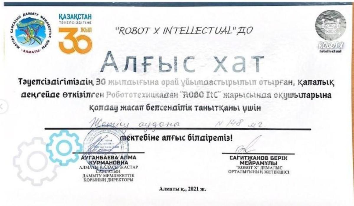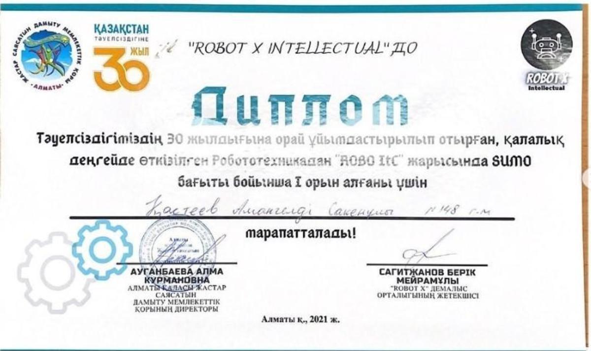 Жетісу ауданы №148 мектеп-гимназияның 8”Ғ” сынып оқушысы Қастеев Амангелді "Тәуелсіздігіміздің 30 жылдығына орай ұйымдастырған қалалық деңгейде өткізілген Робототехникадан "ROBO Itc" жарысында SUMO бағыты бойынша І ОРЫНҒА ие болды.