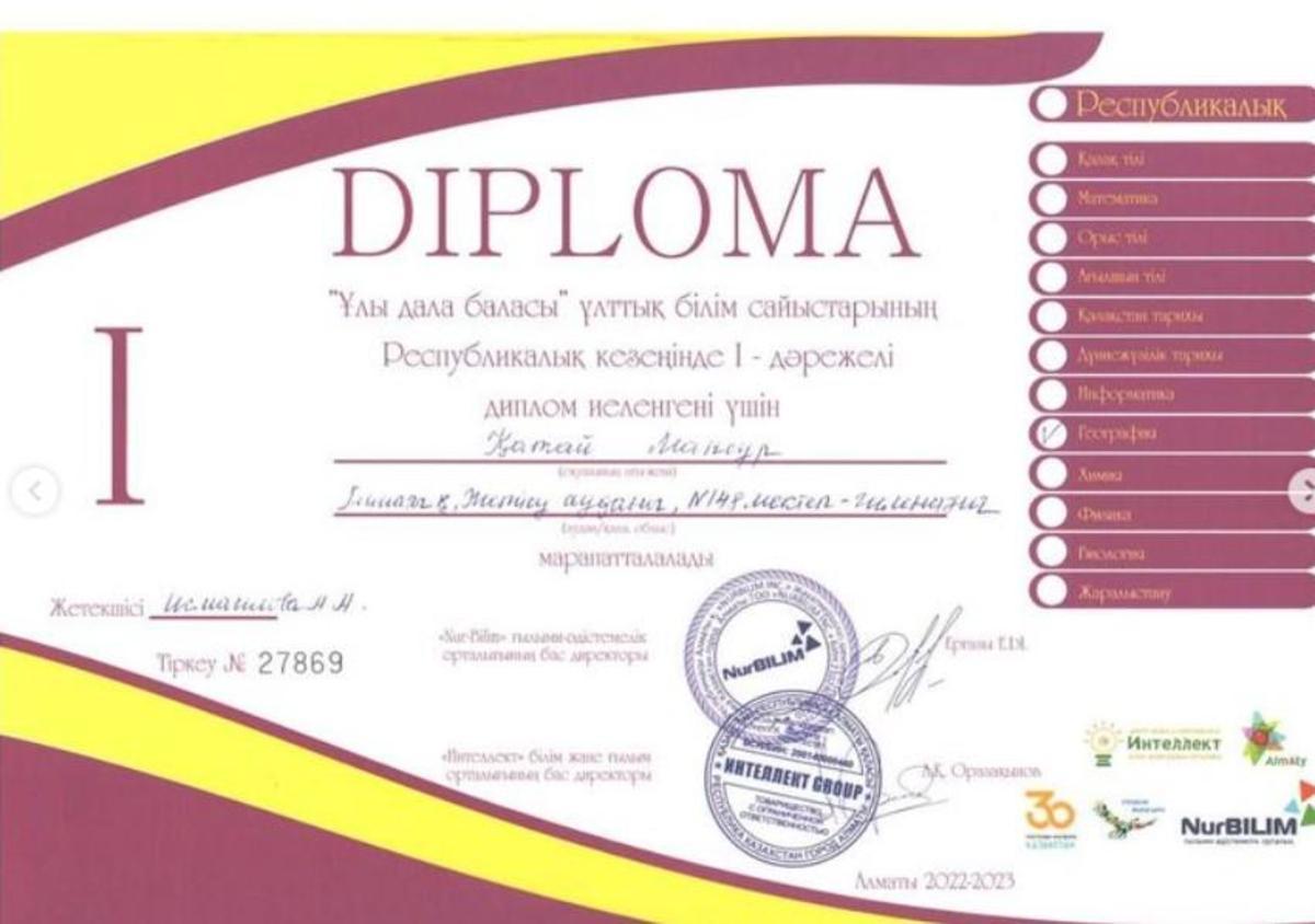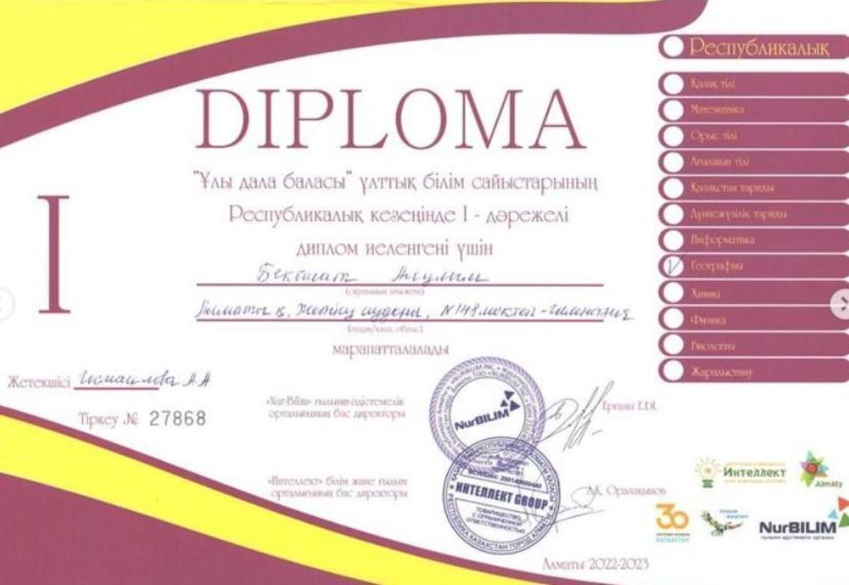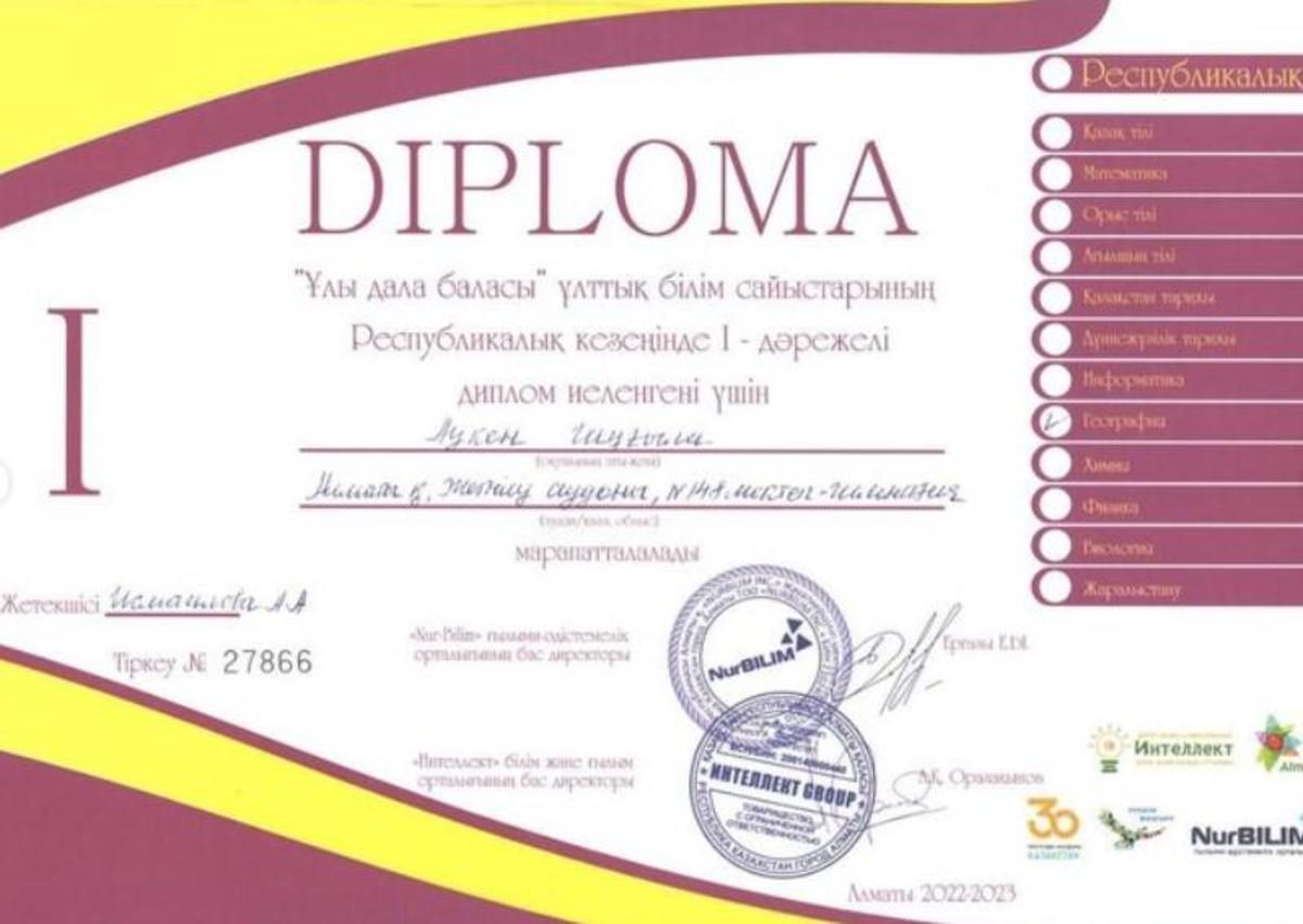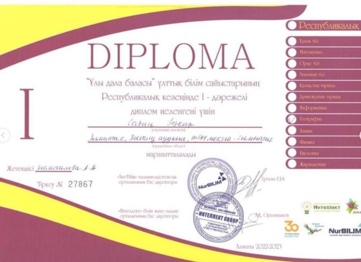 Жетісу ауданы №148 мектеп-гимназияның 9-сынып оқушысы Аскарова Камила, 11-сынып оқушылары Саған Іңкар, Аукен Шұғыла, Бекболат Аяулым, Ахметжанова Жібек, Қатай Мансұр «Ұлы дала баласы” ұлттық білім сайыстарының Республикалық кезеңінде І дәрежелі диплом иеленгендері үшін марапатталды.