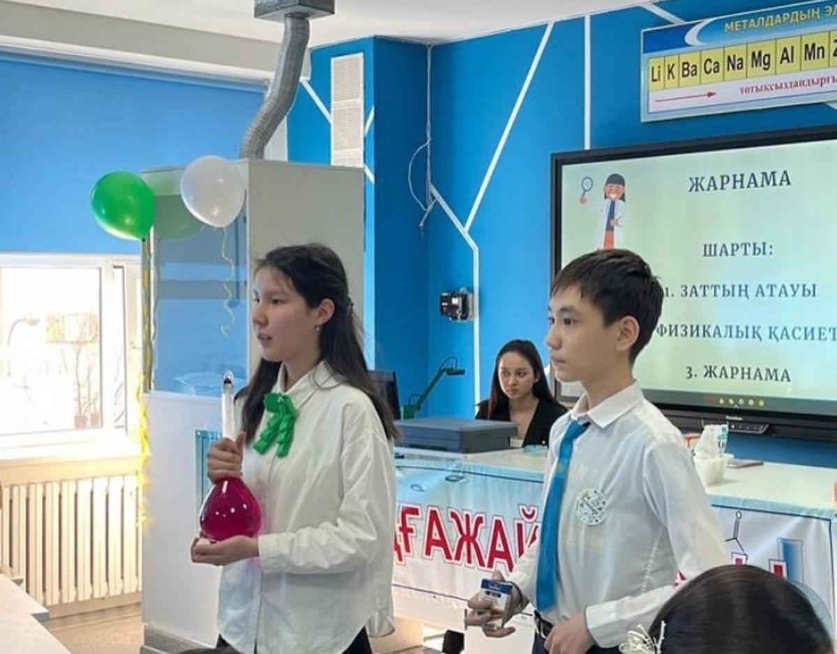 жаратылыстану-ғылыми пәндер кафедрасының онкүндігі аясында химия пәнінің мұғалімдері Тәлен Салтанат, Атакулова Жанар, Тегис Әсел "Химия ғажайыптар әлемі" тақырыбында 9 сынып оқушыларының арасында интеллектуалды-танымдық шоу ұйымдастырды.