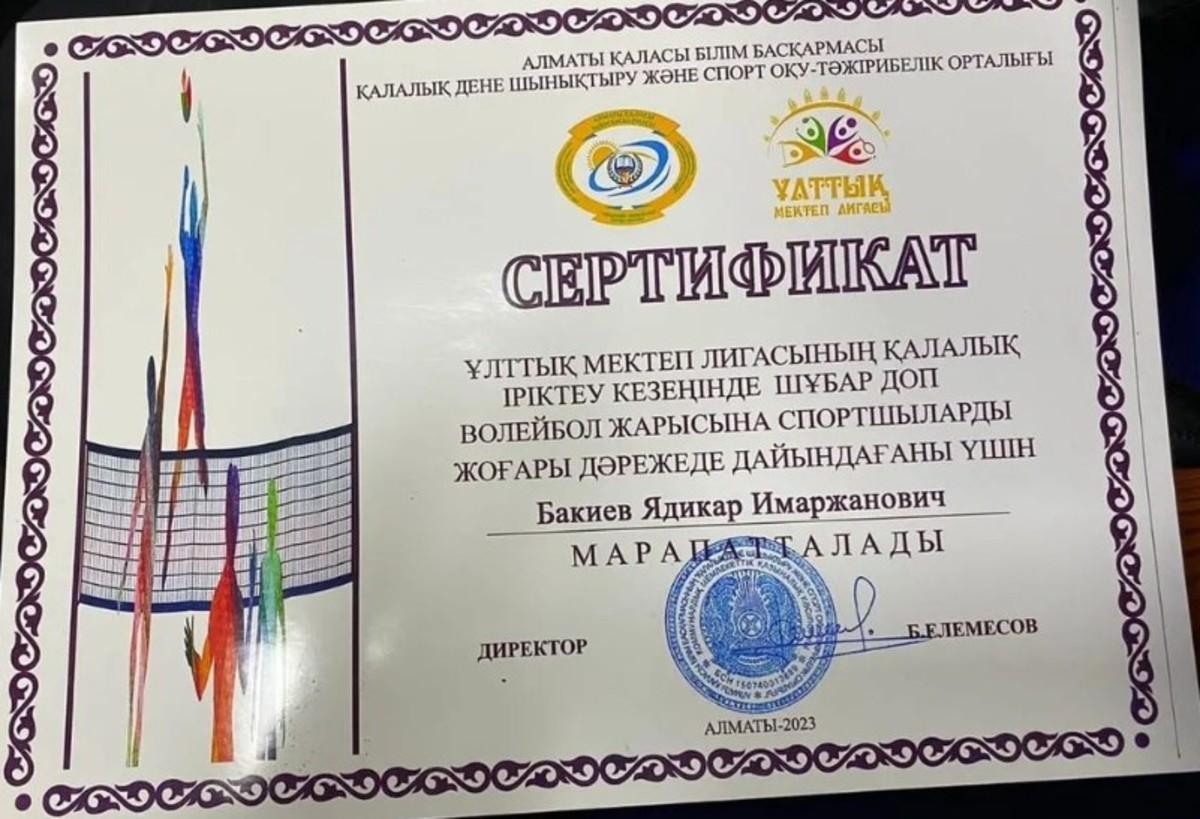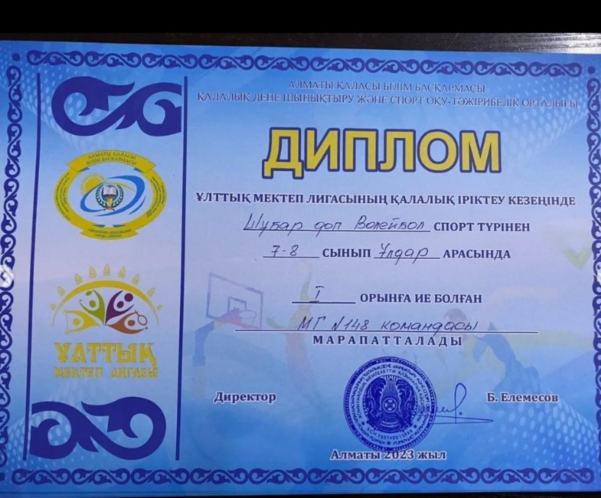 Жетісу ауданы №148 мектеп-гимназияның "148 МГ командасы" 7-8 сынып ұлдар арасында ұйымдастырылған Ұлттық мектеп лигасының қалалық іріктеу кезеңінде "Шұбар доп Валейбол" спорт түрінен I орын иеленіп республикаға жолдама алып, дипломмен марапатталды.