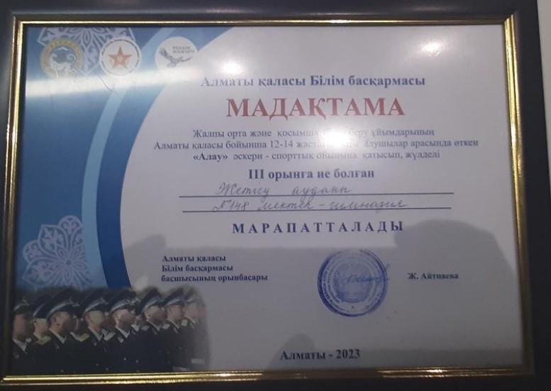 Жетісу ауданы №148 мектеп-гимназияның оқушылары Жалпы орта және қосымша білім беру ұйымдарының Алматы қаласы бойынша 12- 14 жастағы қатысушылар арасында өткен әскери-спорттық ойынға қатысып, жүлделі lll орынға ие болды.