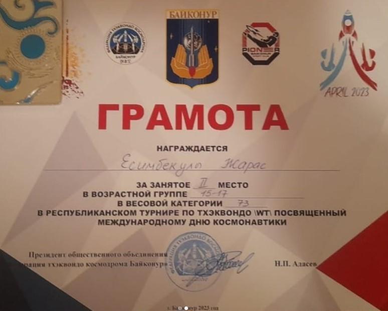 Жетісу ауданы №148 мектеп-гимназияның 8 “Д” сынып оқушысы Есімбекұлы Жарас Таеквондодан (WT) Ғарышкерлер күніне арналған ашық Республикалық турнирде 15-17 жас аралығында 73кг салмақ дәрежесінде 2-ші орынға ие болды