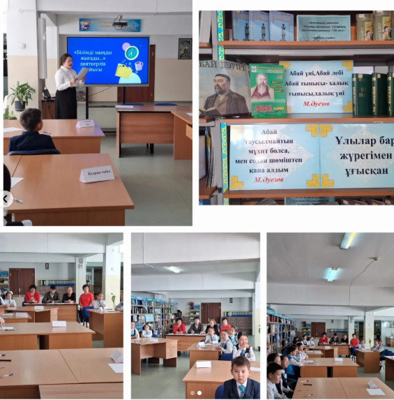 Мектеп кітапханасында 5-сынып оқушылары арасында «Білімді мыңды жығады» атты зияткерлік сайыс ұйымдастырылды. Іс-шараны 6 “Ғ” сынып жетекшісі Нұрсұлтанова А. және 5 “Д” сынып жетекшісі Сагипова Г. К. бірлесіп өткізді.