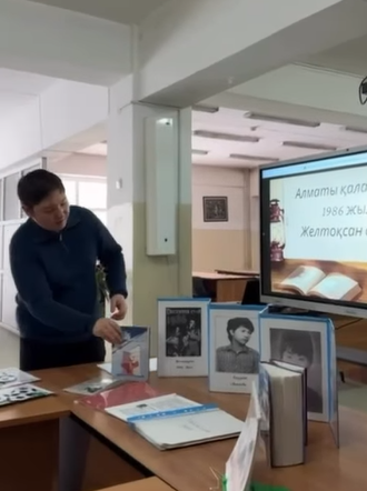 Іс-шараны тарих пәні мұғалімі Исахов Ердәулет өткізді. Мектеп кітапханашылары Бекқазиева Күлпәш пен Қосаманова Ж. Желтоқсан оқиғасына қатысты құнды деректерді қамтыған кітап көрмесін ұсынып, оқушыларға мазмұнды мәліметтер берді.