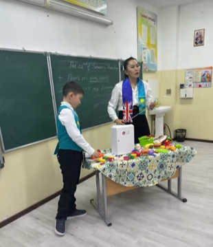 Жаңа сабақта жасанды интеллект (ЖИ) көмегімен жаңа сөздермен таныстырылып, мәтінмен жұмыс жүргізілді. Оқушылар Imperative (бұйрық рай) грамматикалық тақырыбын пайдалана отырып, «Сірне асы» тағамын дайындау тапсырмасын орындады. Сонымен қатар There is / There are, some / any құрылымдарын қолдану арқылы салқындатқыштағы тағамдардың бар-жоғын анықтады.