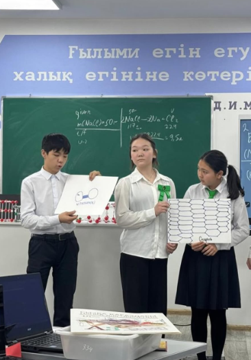 Сабақ барысында оқушылар заттардың қасиетінің кристалдық тор түріне тәуелділігін әртүрлі тәжірибелер арқылы зерттеді, Classin қосымшасы арқылы кристалдық тордың 3D бейнесін көріп, түрлі кристалдық тор түрлерін жасап үйренді. Сонымен қатар, оқушылар әртүрлі деңгейдегі есептерді орындау арқылы білімдерін бекітті.