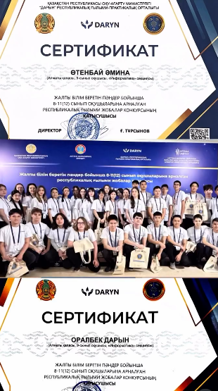 Оқушыларымыз ғылыми жобаларын жоғары деңгейде қорғап, сертификат иегерлері атанды. Бұл – табандылық пен үздіксіз ізденістің нәтижесі.