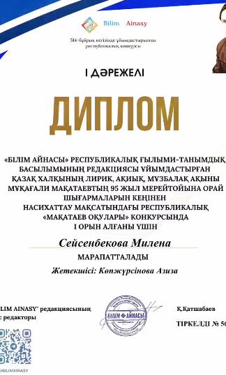 Жетісу ауданы №148 мектеп-гимназия 2 «Д» сынып оқушысы Сейсенбекова Милена республикалық «Мақатаев оқулары» байқауында І орынға ие болып, I дәрежелі дипломмен марапатталды.