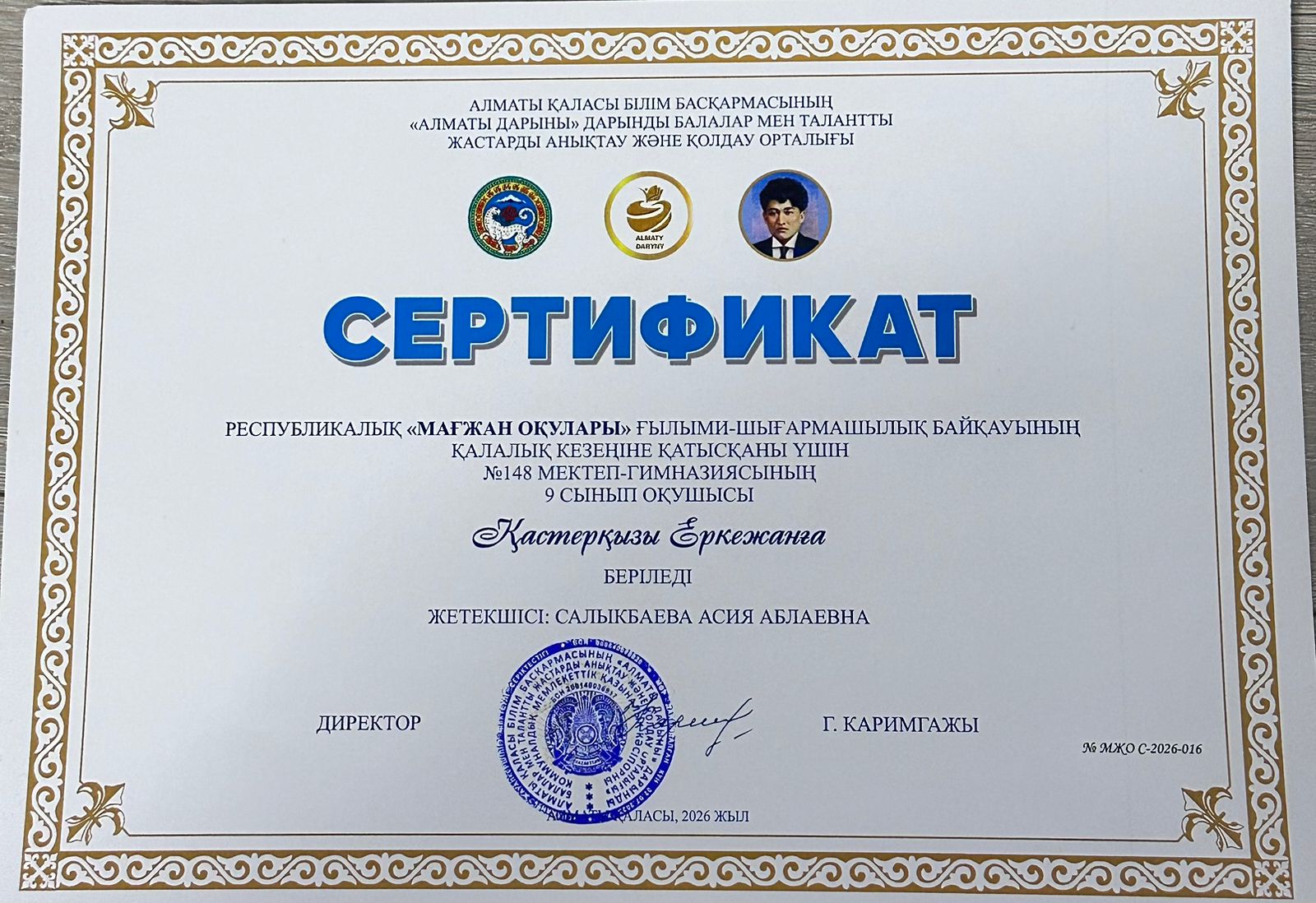 Қастерқызы Еркежан Республикалық «Мағжан оқулары» байқауының қалалық кезеңінде ІІІ орын иегері атанды