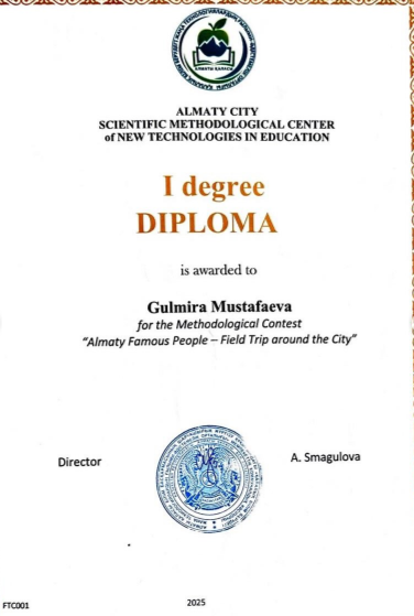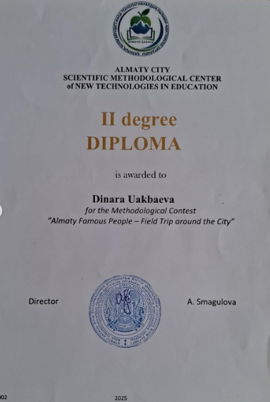 Қалалық ағылшын тілі мұғалімдері арасында өткен «Almaty Famous People – Field Trip around the City» атты әдістемелік байқауда жүлделі орындарға ие болған ұстаздарымызды құттықтаймыз!