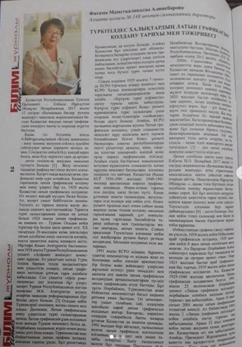 Жетісу ауданы №148 мектеп-гимназияның директоры Фатима Маметқалиқызы Алиақбарованың "Білім times" Республикалық ғылыми-әдістемелік педагогикалық журналында "Түркітілдес халықтардың латын графикасын қолдану тарихы мен тәжірибесі" тақырыбындағы мақаласы жарық көрді.