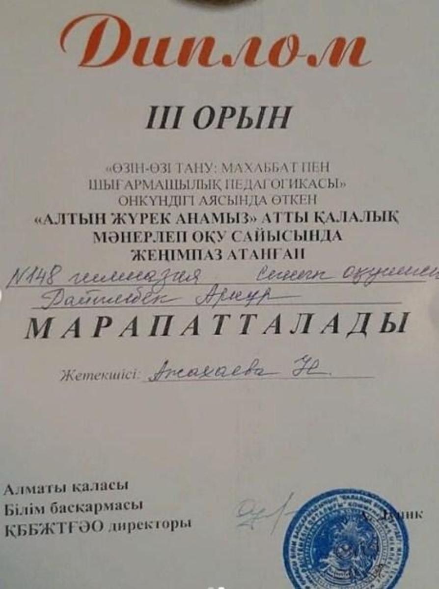 №148 мектеп-гимназияның 8"Г" сынып оқушысы РАЙЫМБЕК АРНҰР Алматы қаласы Білім басқармасы ҚББЖТҒӘ орталығының ұйымдастыруымен өткен "ӨЗІН-ӨЗІ ТАНУ: МАХАББАТ ПЕН ШЫҒАРМАШЫЛЫҚ ПЕДАГОГИКАСЫ" онкүндігі аясында өткен "АЛТЫН ЖҮРЕК АНАМЫЗ" атты қалалық мәнерлеп оқу сайысына қатысып жүлделі ІІІ ОРЫН иеленді. Жетекшесі Ажахаева Назгүл.